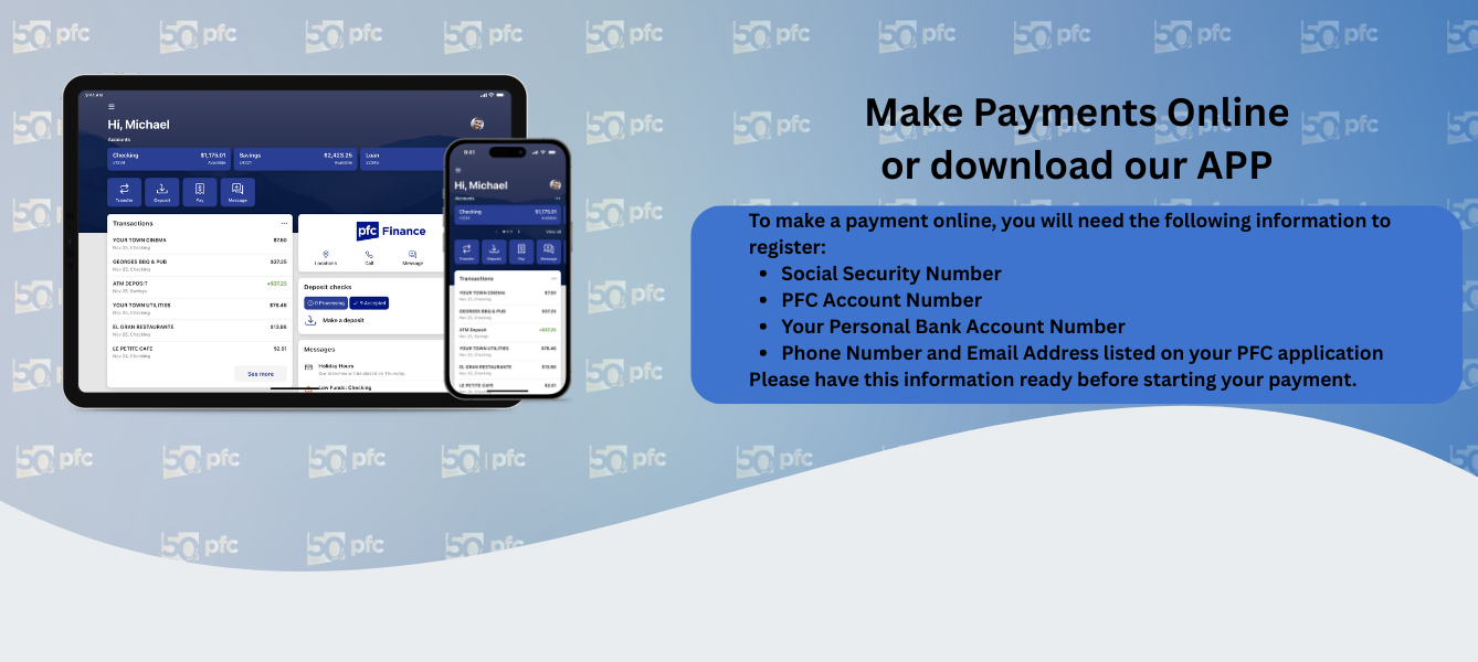 Balances reflected on your online payment profile does not state the current "Payoff Balance". To obtain this balance please contact a PFC center for further information. Payments processed through our online payment site will be posted the following business day on your PFC account, and may take 2-5 days to clear from your personal account.